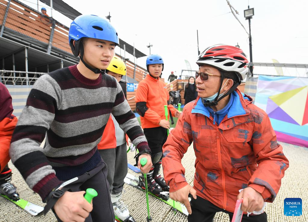 Coach Cao Jian instructs as members of the "Dieyun" ski team learn at a dry ski training facility in Xindu District of Chengdu, southwest China's Sichuan Province, Feb. 25, 2022. When seeing the boys and girls skiing down the slope, no one will realize they are anything different from other ski-loving youngsters until noticing their coach communicating with them mainly through writing and gesturing.