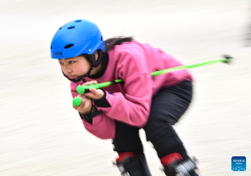 Member of the "Dieyun" ski team Wang Xinyue practices in a training session at a dry ski training facility in Xindu District of Chengdu, southwest China's Sichuan Province, Feb. 25, 2022. When seeing the boys and girls skiing down the slope, no one will realize they are anything different from other ski-loving youngsters until noticing their coach communicating with them mainly through writing and gesturing.
