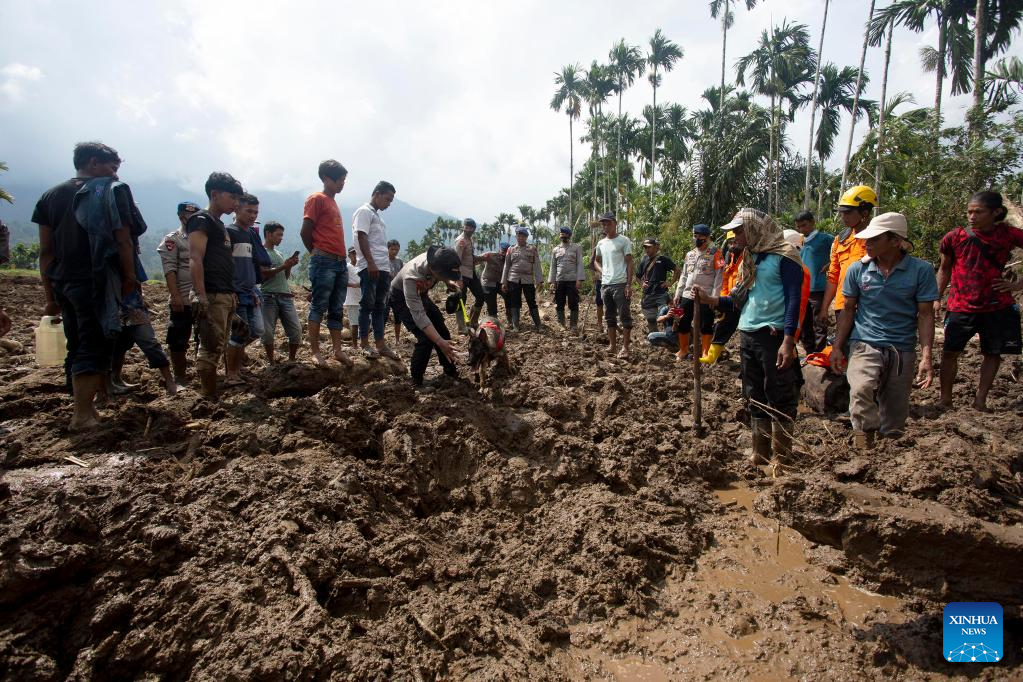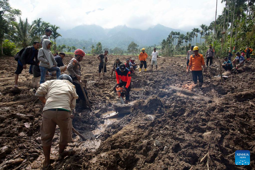 People search in a muddy area caused by landslides after a 6.1 magnitude quake in Pasaman Barat, West Sumatra, Indonesia, Feb. 27, 2022. (Photo by Andry Mardiansyah/Xinhua)
