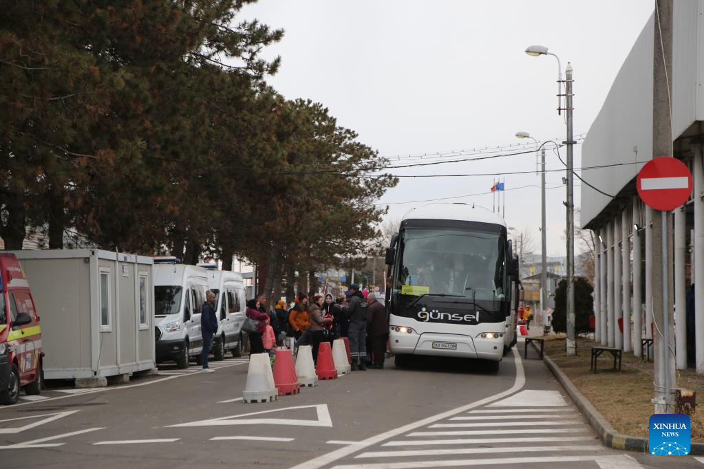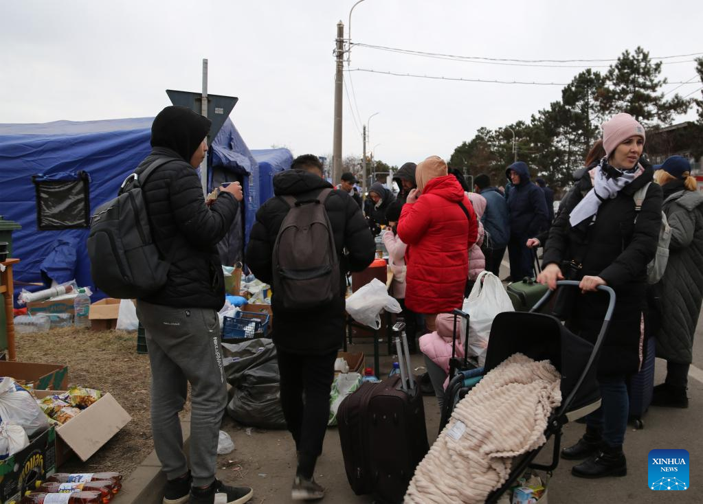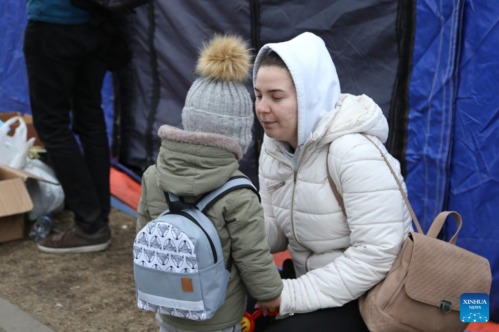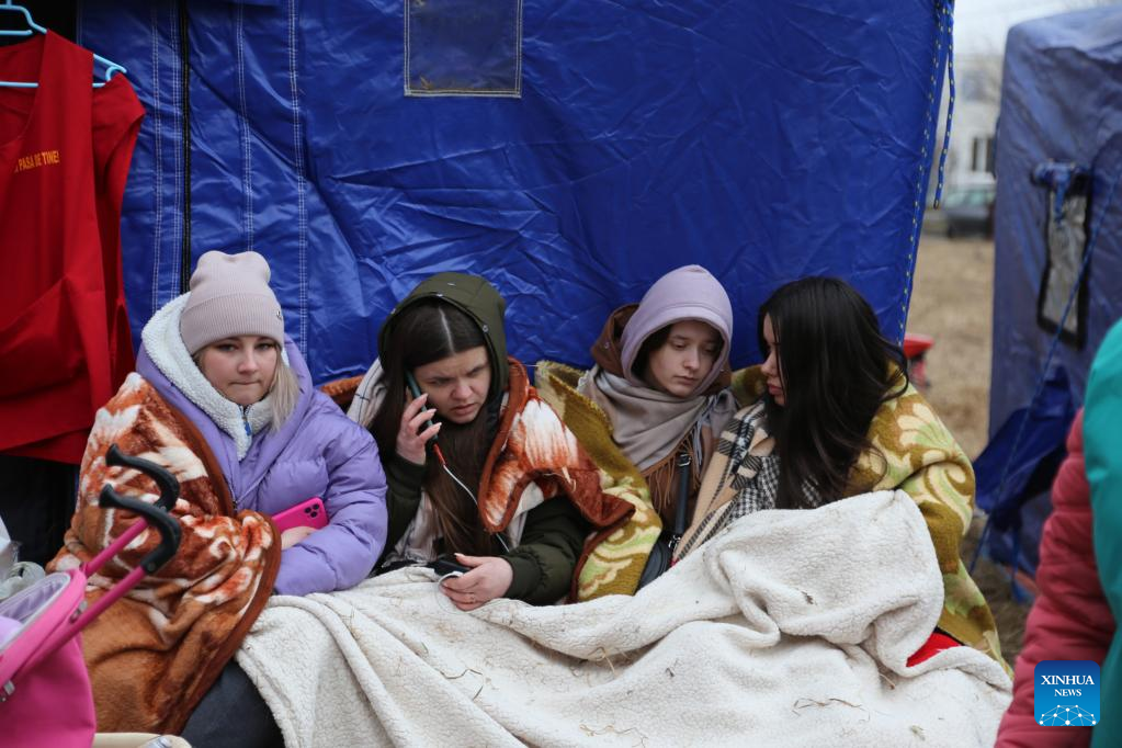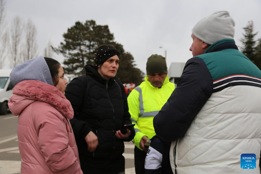 Photo taken on Feb. 27, 2022 shows Ukrainian people in Siret, Romania. Recently, a large number of Ukrainian people have arrived at the borders with Romania. (Xinhua/Lin Huifen)