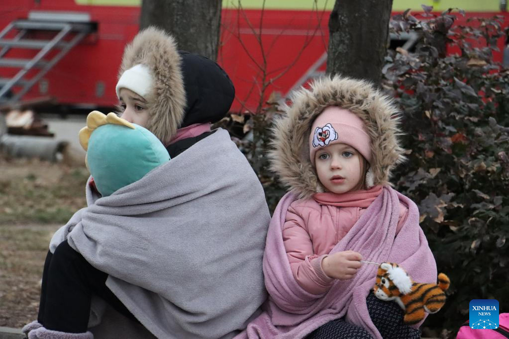 Photo taken on Feb. 27, 2022 shows Ukrainian children in Siret, Romania. Recently, a large number of Ukrainian people have arrived at the borders with Romania. (Xinhua/Lin Huifen)