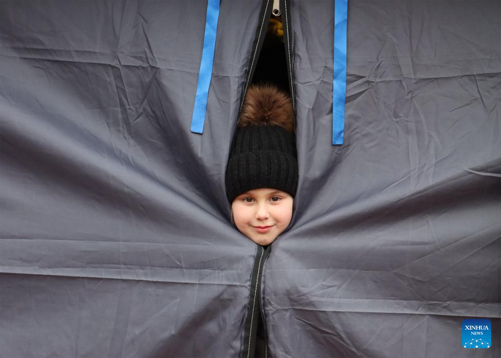 Photo taken on Feb. 27, 2022 shows a child in Siret, Romania. Recently, a large number of Ukrainian people have arrived at the borders with Romania. (Xinhua/Lin Huifen)