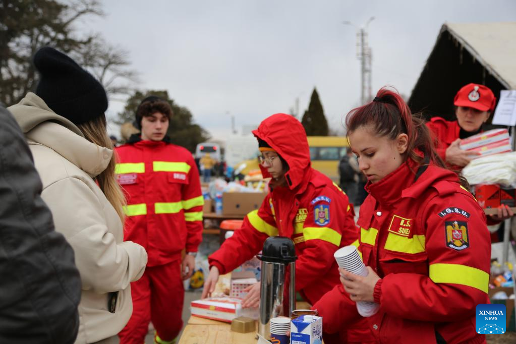 Staff members provide hot drinks to Ukrainian people in Siret, Romania, Feb. 27, 2022. Recently, a large number of Ukrainian people have arrived at the borders with Romania. (Xinhua/Lin Huifen)