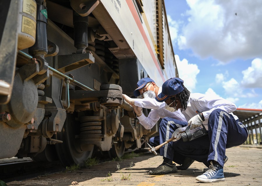 Staff members check a train at Nairobi station of Mombasa-Nairobi Standard Gauge Railway (SGR) in Nairobi, Kenya, March 22, 2021. (Xinhua/Li Yan)