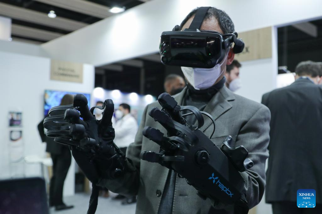 A man tries HaptX's haptic gloves for virtual reality and robotics during the Mobile World Congress in Barcelona, Spain, on Feb. 28, 2022. The 2022 edition of the Mobile World Congress opened its doors on Monday, for a four-day event that is expected to host between 40,000 and 60,000 people. (Xinhua/Zheng Huansong)