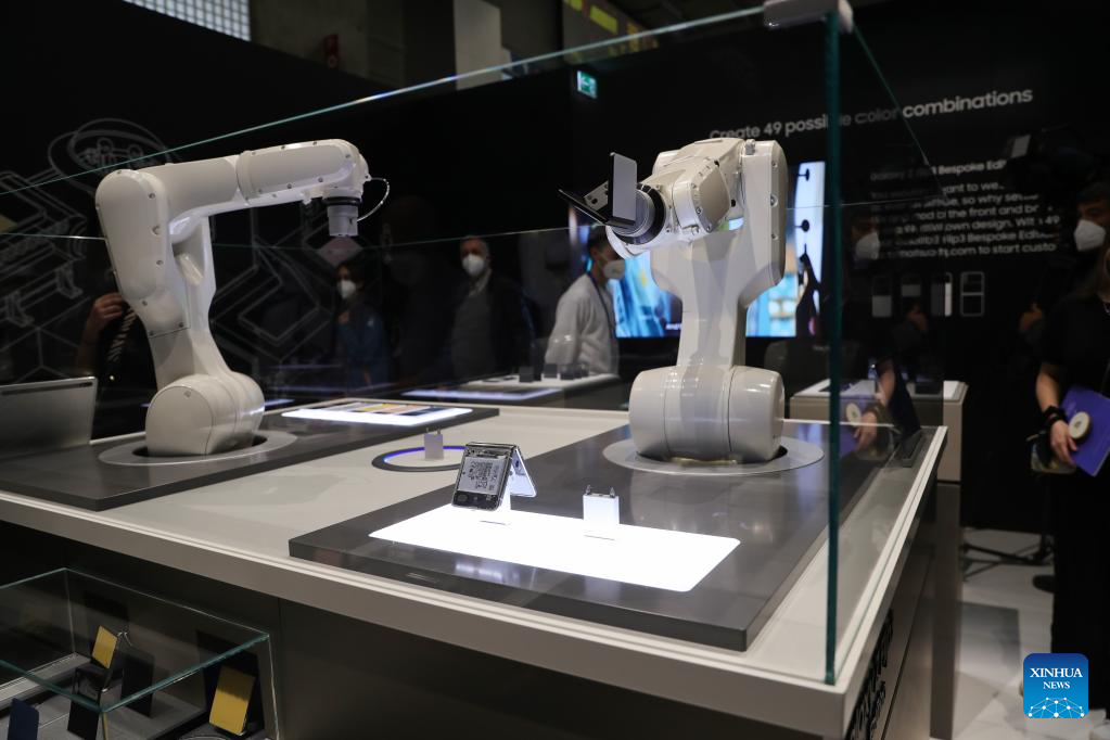 Robots show customized cellphone service at Samsung's exhibition area during the Mobile World Congress in Barcelona, Spain, on Feb. 28, 2022. The 2022 edition of the Mobile World Congress opened its doors on Monday, for a four-day event that is expected to host between 40,000 and 60,000 people. (Xinhua/Zheng Huansong)