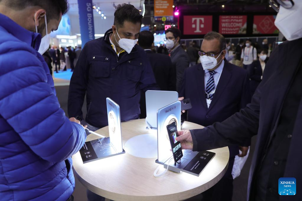 Visitors view newly-launched OPPO phones during the Mobile World Congress (MWC) in Barcelona, Spain, Feb. 28, 2022. The 2022 edition of the MWC is held from Feb. 28 to March 3. (Xinhua/Zheng Huansong)