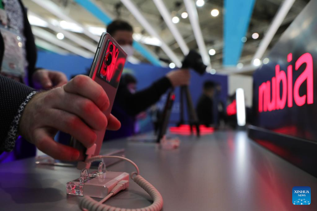A man tries a Nubia's new Z40 series cellphone during the Mobile World Congress in Barcelona, Spain, on Feb. 28, 2022. The 2022 edition of the Mobile World Congress opened its doors on Monday, for a four-day event that is expected to host between 40,000 and 60,000 people. (Xinhua/Zheng Huansong)