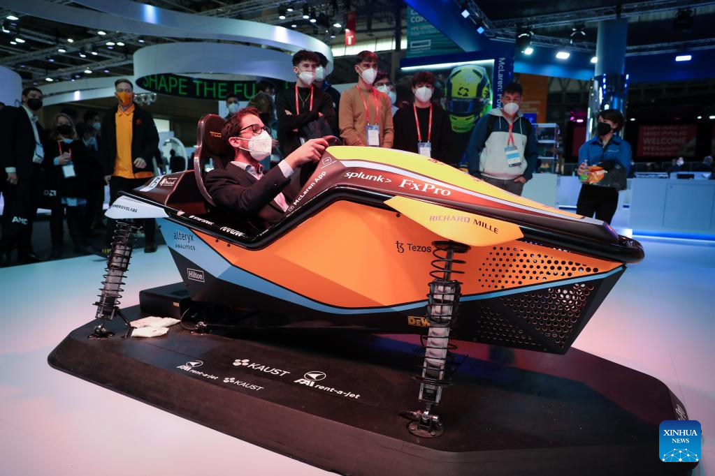 A visitor experiences a simulated driving device during the Mobile World Congress (MWC) in Barcelona, Spain, Feb. 28, 2022. The 2022 edition of the MWC is held from Feb. 28 to March 3. (Xinhua/Zheng Huansong)