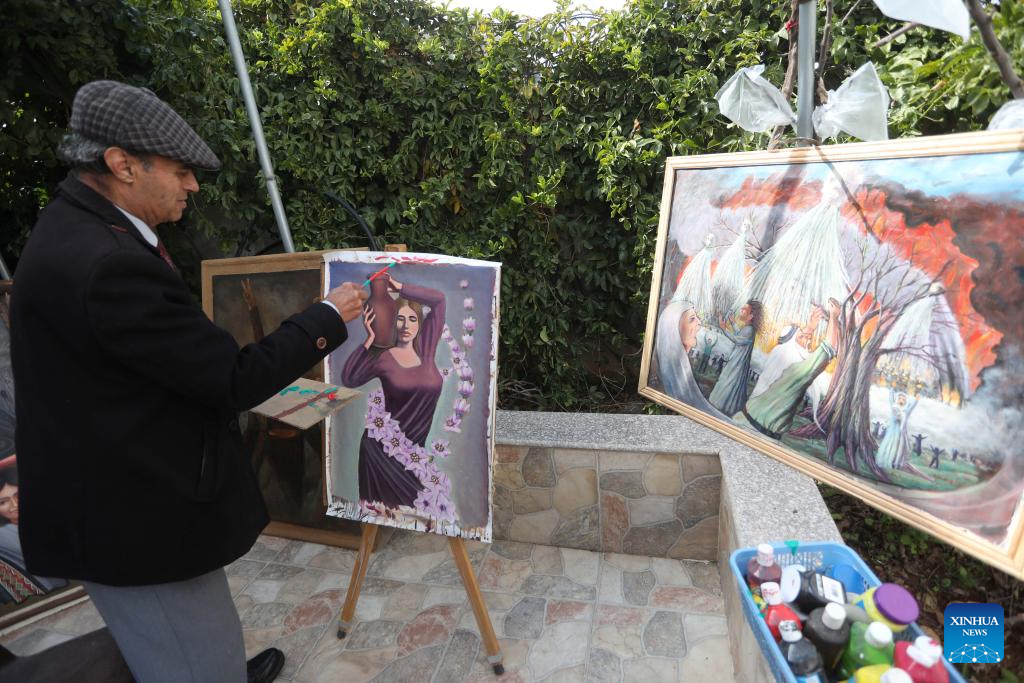 Murshid Gharib, a 73-year-old painter from Jenin who has about 50 years of experience in painting murals, works on a painting at his house in the West Bank city of Jenin, Feb. 21, 2022. TO GO WITH "Feature: Palestine artists turn walls into canvas for hope" (Photo by Ayman Nobani/Xinhua)