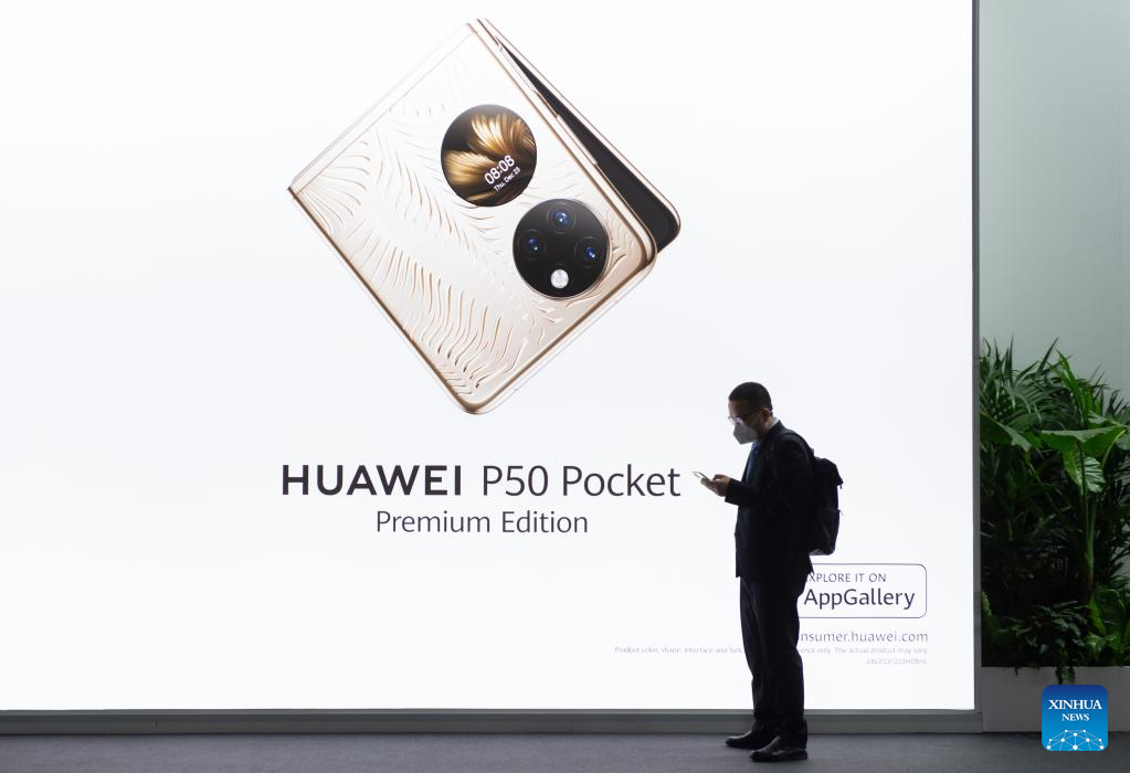 A man stands in front of a poster showing a Huawei's foldable cellphone during the Mobile World Congress (MWC) in Barcelona, Spain, on March 1, 2022. Around 50 Chinese companies, including Huawei, ZTE and Xiaomi, are present at the annual Mobile World Congress (MWC), which opened its doors here on Monday. (Photo by Gustavo Valiente/Xinhua)