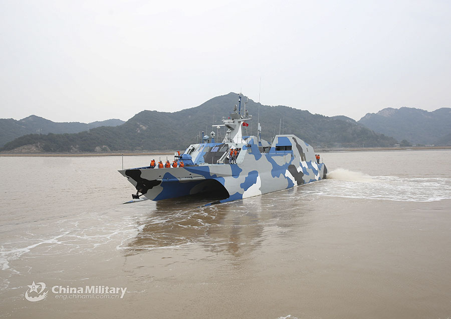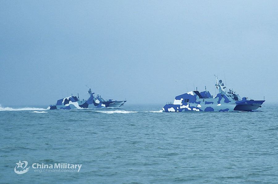Fast attack missile boats attached to a group with the navy under the PLA Eastern Theater Command steam in formation during a maritime training exercise in waters of the East China Sea on February 22, 2022. (eng.chinamil.com.cn/Photo by Du Kecheng)