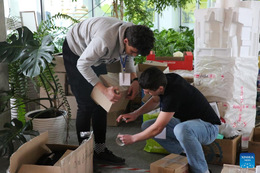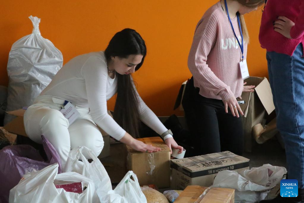 Students arrange supplies at a university in Lviv, Ukraine, March 1, 2022. (Xinhua/Chen Wenxian)