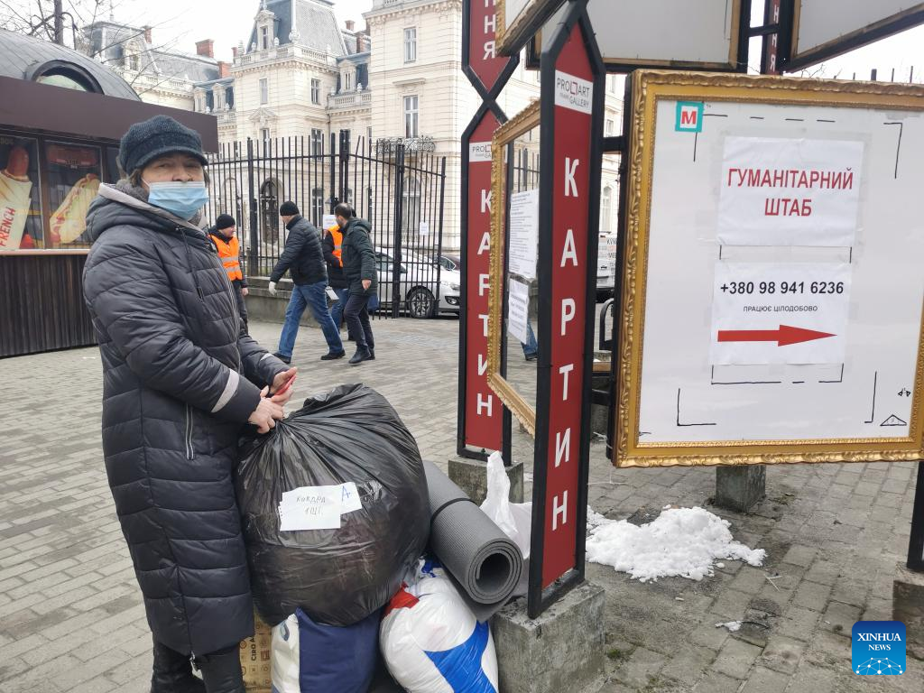 Photo taken on March 1, 2022 shows a supply distribution site in Lviv, Ukraine. (Xinhua/Chen Wenxian)