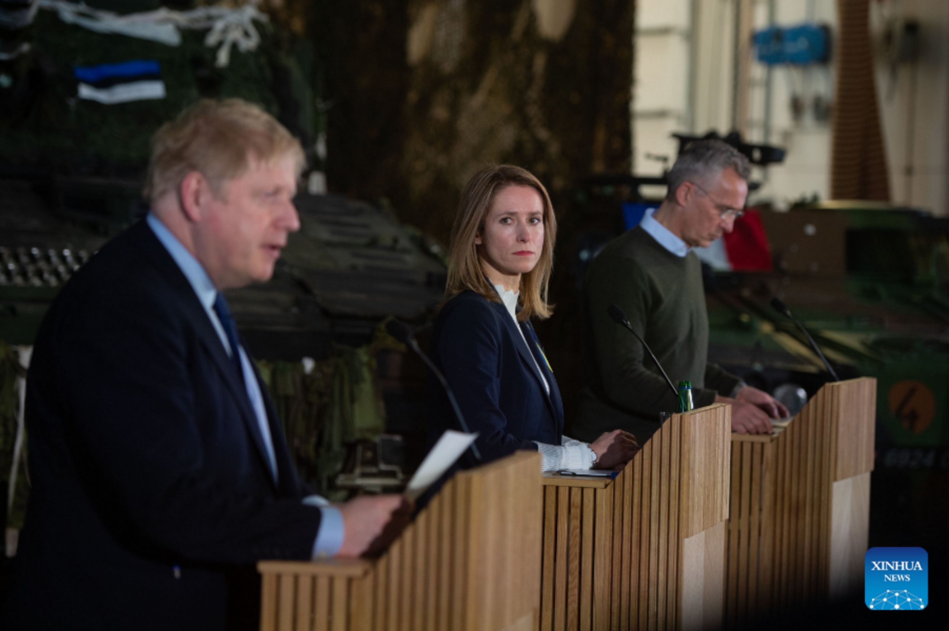 Estonian Prime Minister Kaja Kallas (C), Secretary General of the North Atlantic Treaty Organization (NATO) Jens Stoltenberg (R) and British Prime Minister Boris Johnson attend a joint press conference at the Tapa Army Base in northern Estonia, March 1, 2022. Visiting Secretary General of the North Atlantic Treaty Organization (NATO) Jens Stoltenberg on Tuesday stressed diplomatic efforts to solve the ongoing Ukraine crisis. Stoltenberg made the remarks at a joint press conference with Estonian Prime Minister Kaja Kallas and visiting British Prime Minister Boris Johnson at the Tapa Army Base in northern Estonia. (Estonian government/Handout via Xinhua)