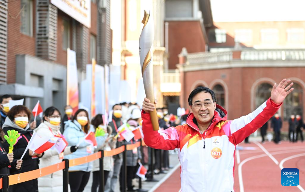 Torchbearer Yao Yufeng runs with the torch during the Beijing 2022 Paralymic Torch Relay and Flame Lighting Ceremony at Beijing School For The Blind in Beijing, capital of China, March 2, 2022.