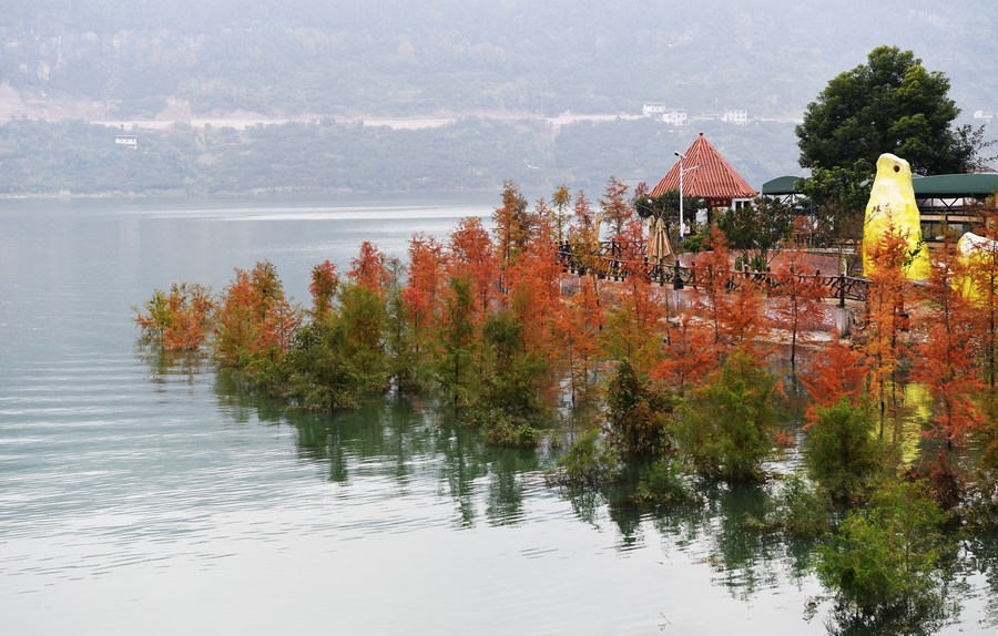 Photo taken on Dec. 10, 2020 shows scenery of taxodium trees near the Yangtze River in Dazhou Town, Wanzhou District of southwest China's Chongqing. (Xinhua/Wang Quanchao)