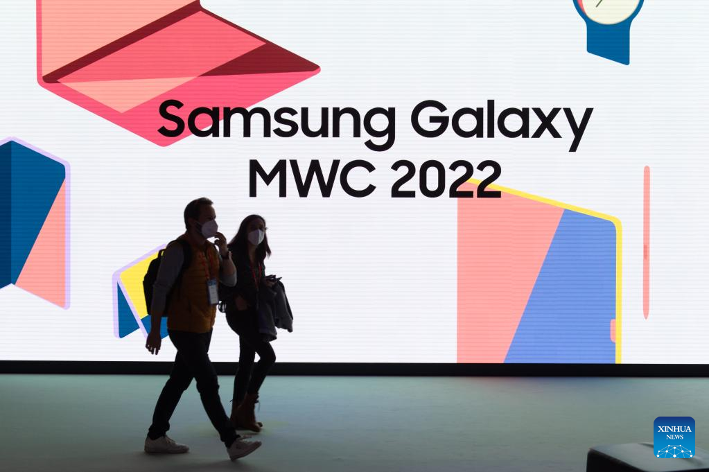 People walk past Samsung's pavilion at the Mobile World Congress (MWC) in Barcelona, Spain, March 2, 2022. The 2022 edition of the Mobile World Congress opened its doors on Feb. 28, for a four-day event that is expected to host between 40,000 and 60,000 people. (Photo by Gustavo Valiente/Xinhua)