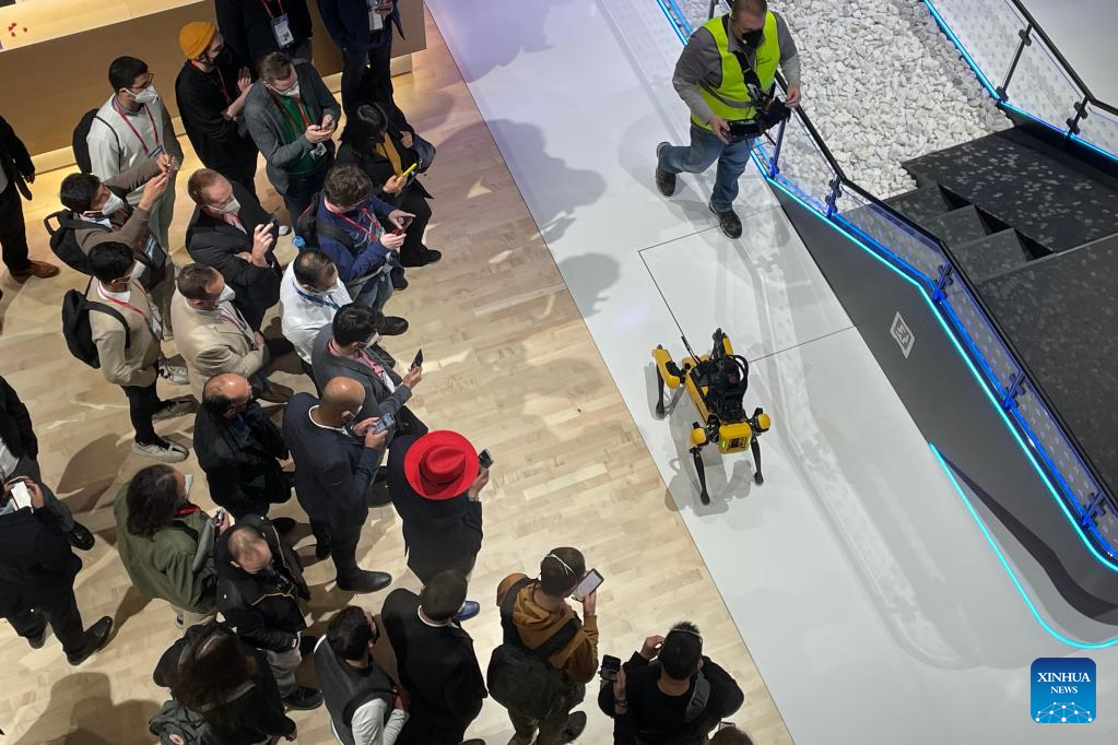 People watch a demo of Boston Dynamics SPOT at the Mobile World Congress (MWC) in Barcelona, Spain, March 2, 2022. The 2022 edition of the Mobile World Congress opened its doors on Feb. 28, for a four-day event that is expected to host between 40,000 and 60,000 people. (Xinhua/Zheng Huansong)