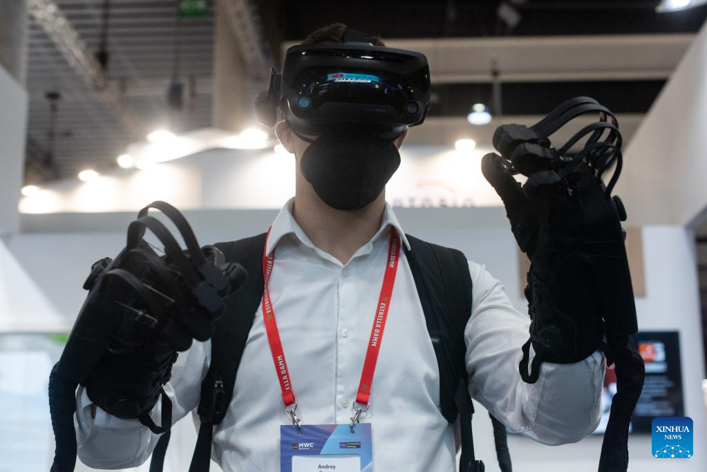 A man tries VR HaptX gloves and glasses at the Mobile World Congress (MWC) in Barcelona, Spain, March 2, 2022. The 2022 edition of the Mobile World Congress opened its doors on Feb. 28, for a four-day event that is expected to host between 40,000 and 60,000 people. (Photo by Gustavo Valiente/Xinhua)
