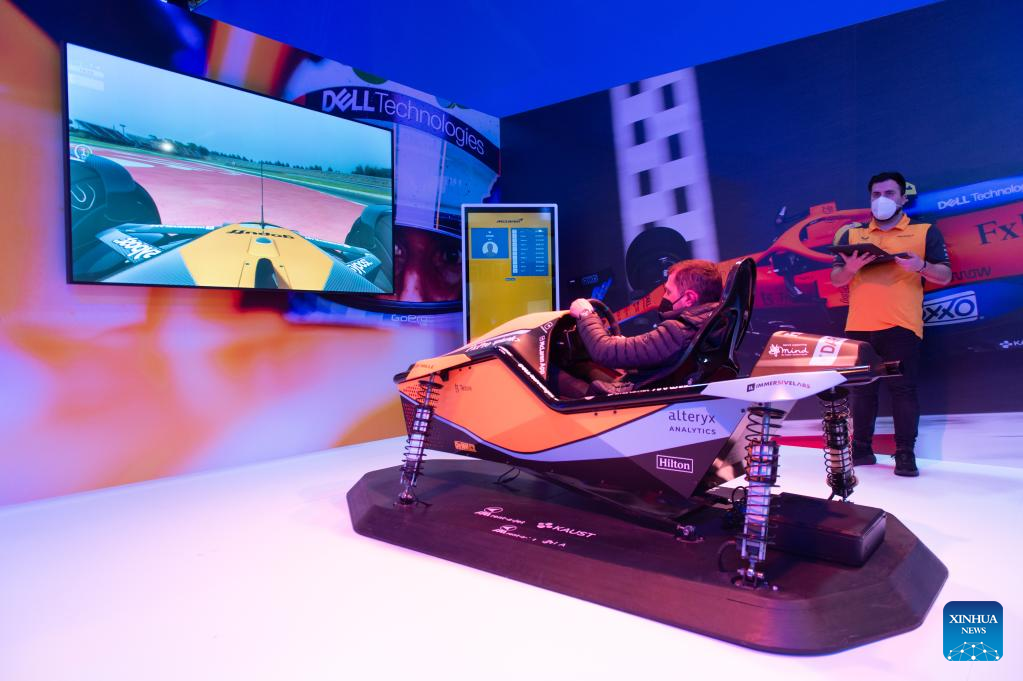 A man experiences a driving simulator at Dell stand at the Mobile World Congress (MWC) in Barcelona, Spain, March 2, 2022. The 2022 edition of the Mobile World Congress opened its doors on Feb. 28, for a four-day event that is expected to host between 40,000 and 60,000 people. (Photo by Gustavo Valiente/Xinhua)