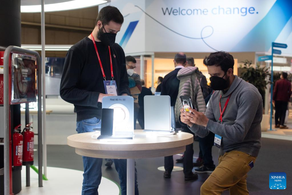 People get information of electronic devices at the Oppo stand at the Mobile World Congress (MWC) in Barcelona, Spain, March 2, 2022. The 2022 edition of the Mobile World Congress opened its doors on Feb. 28, for a four-day event that is expected to host between 40,000 and 60,000 people. (Photo by Gustavo Valiente/Xinhua)