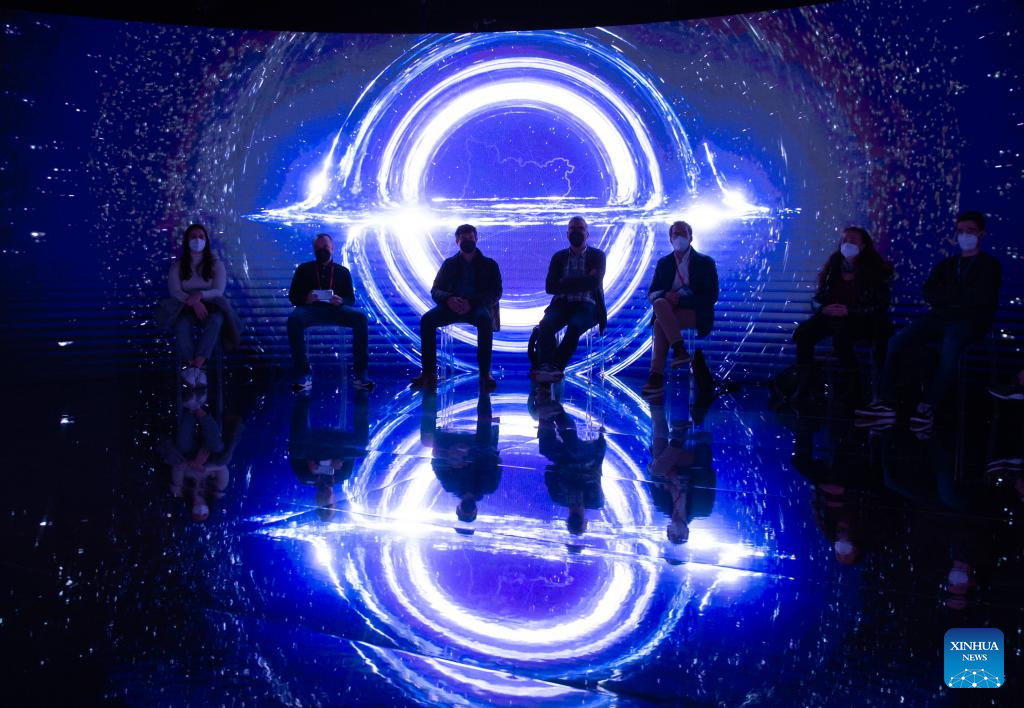 Visitors watch an immersive 360 holographic show at Barcelona Looks Up stand at the Mobile World Congress (MWC) in Barcelona, Spain, March 2, 2022. The 2022 edition of the Mobile World Congress opened its doors on Feb. 28, for a four-day event that is expected to host between 40,000 and 60,000 people. (Photo by Gustavo Valiente/Xinhua)