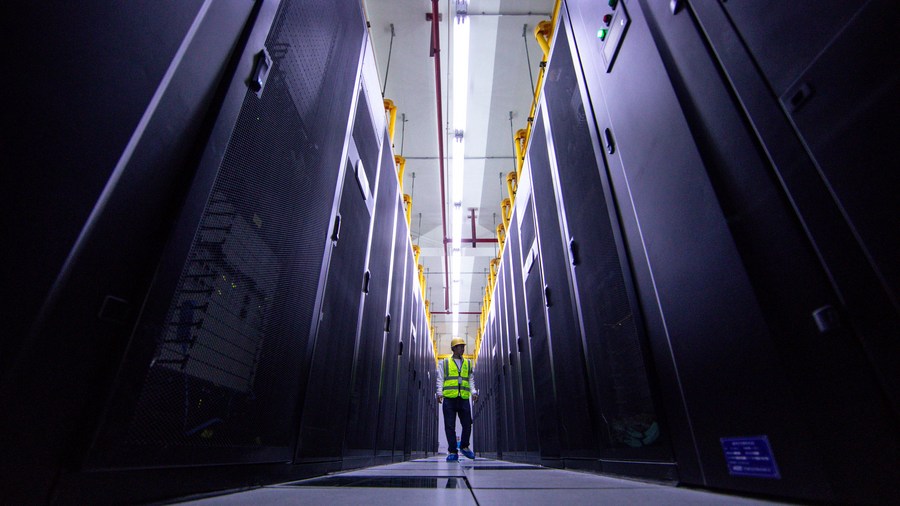 A staff member checks equipment at a data center of China Mobile in southwest China's Guizhou Province, May 24, 2021. (Xinhua/Ou Dongqu)