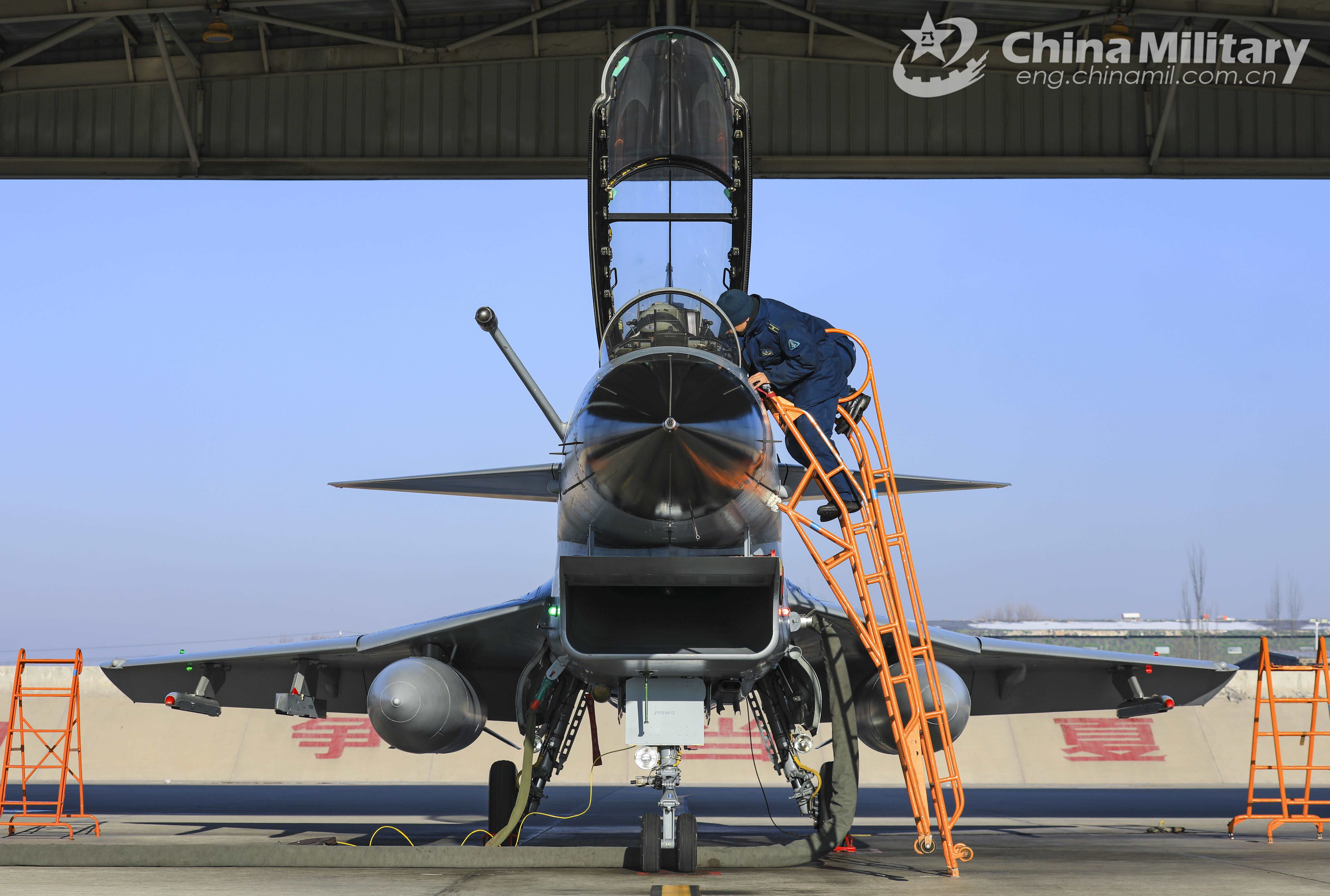 A maintenance man assigned to an aviation brigade of the air force under the PLA Central Theater Command performs last-minute inspections on a J-10 fighter jet prior to a round-the-clock combat flight training exercise on February 23, 2022. (eng.chinamil.com.cn/Photo by Jin Huidong)