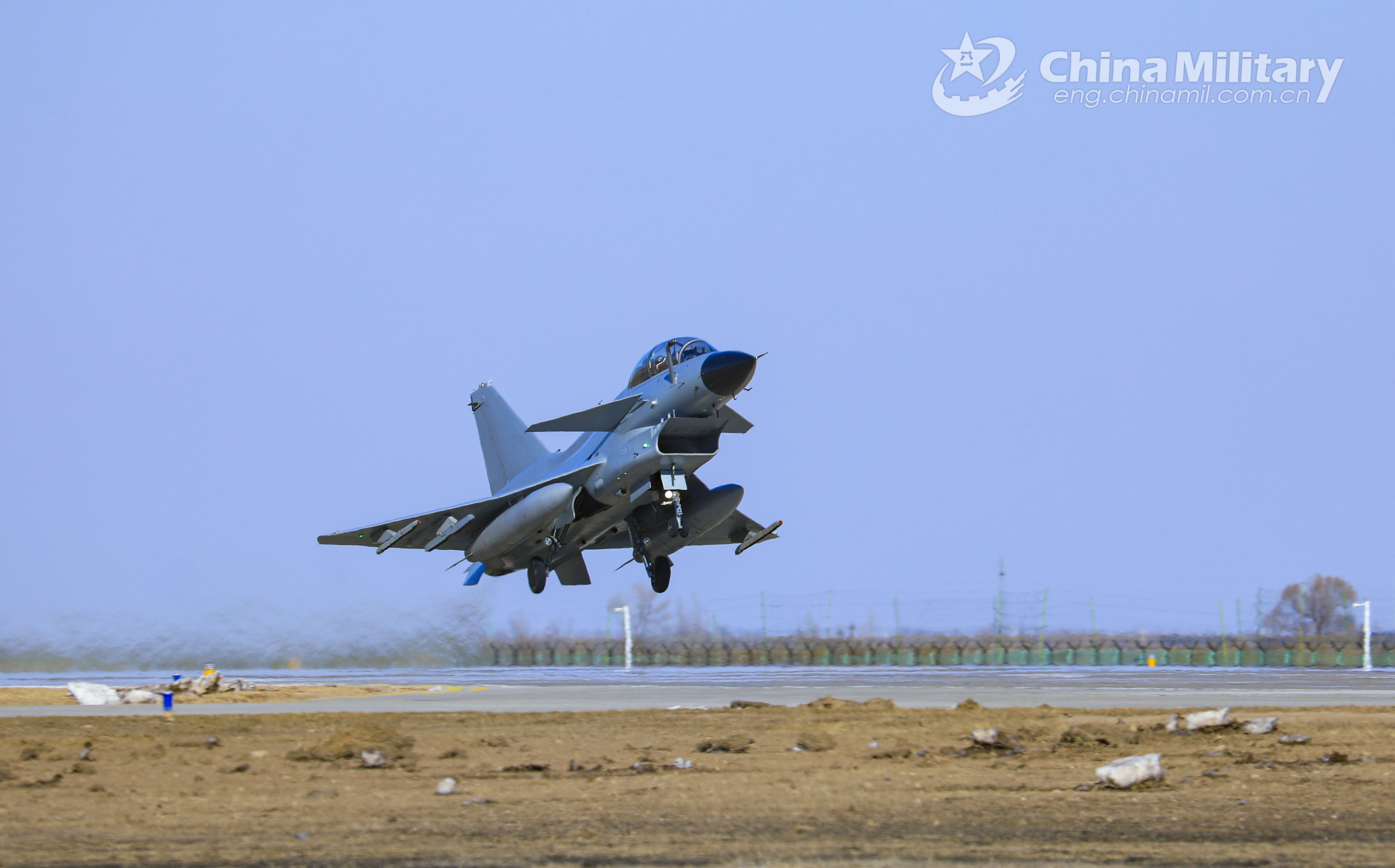 A J-10 fighter jet attached to an aviation brigade of the air force under the PLA Central Theater Command takes off from the runway during a round-the-clock combat flight training exercise on February 23, 2022. (eng.chinamil.com.cn/Photo by Jin Huidong)