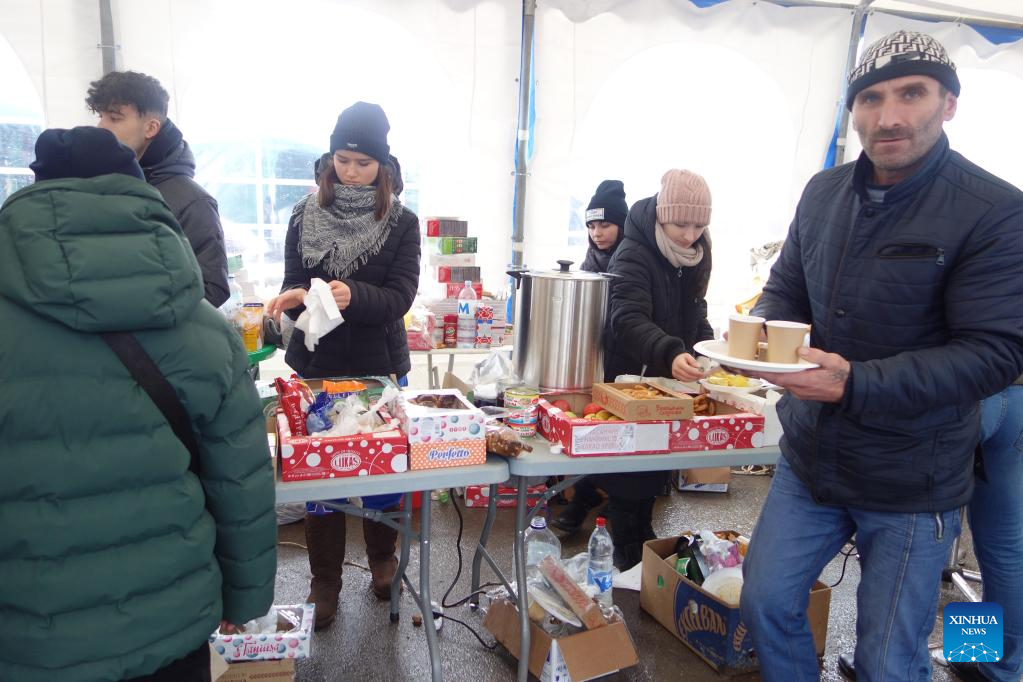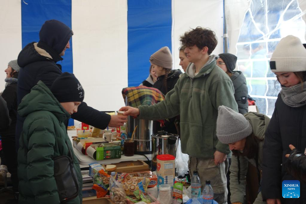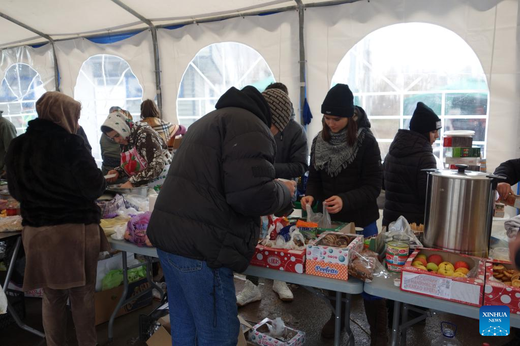 Volunteers distribute food to people from Ukraine at Palanca checkpoint, Moldova, March 2, 2022. (Xinhua/Wang Qing)