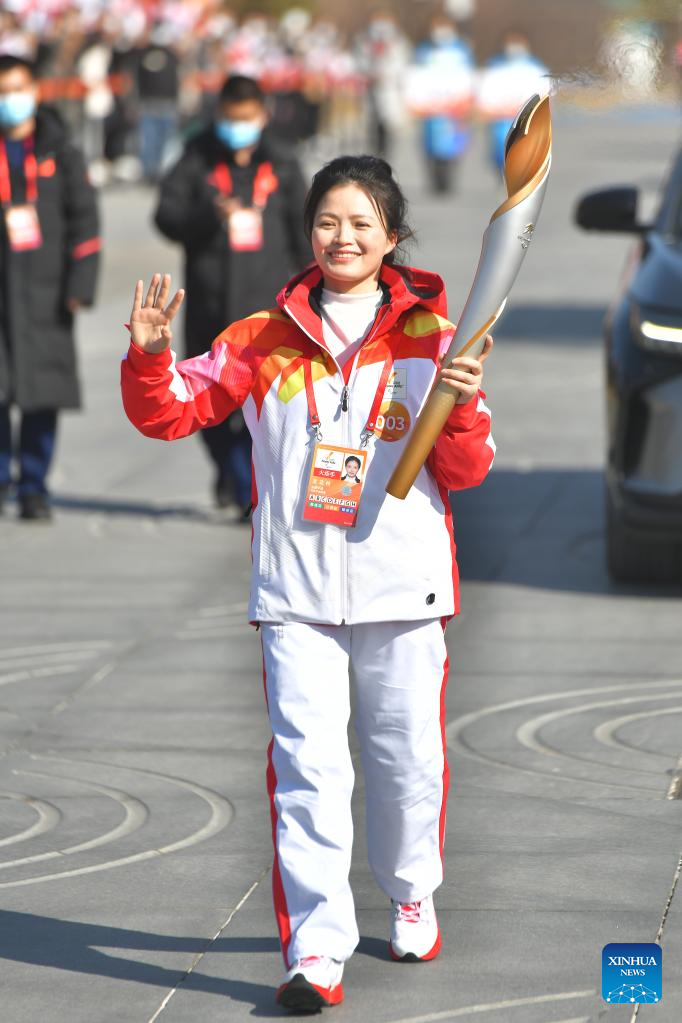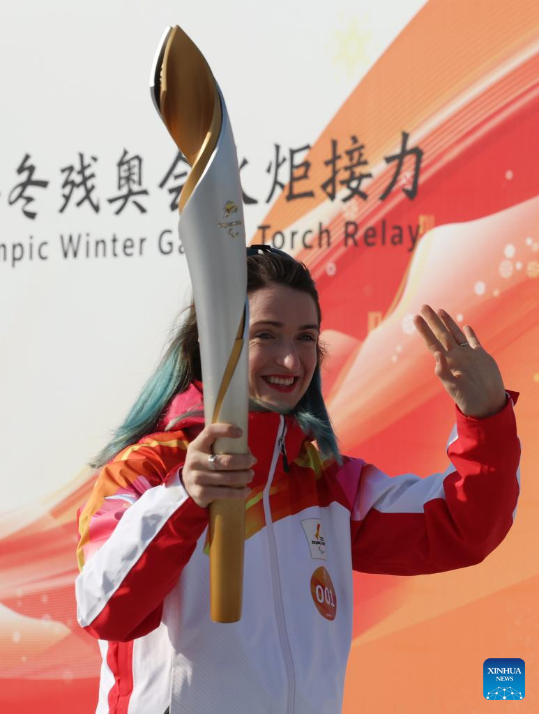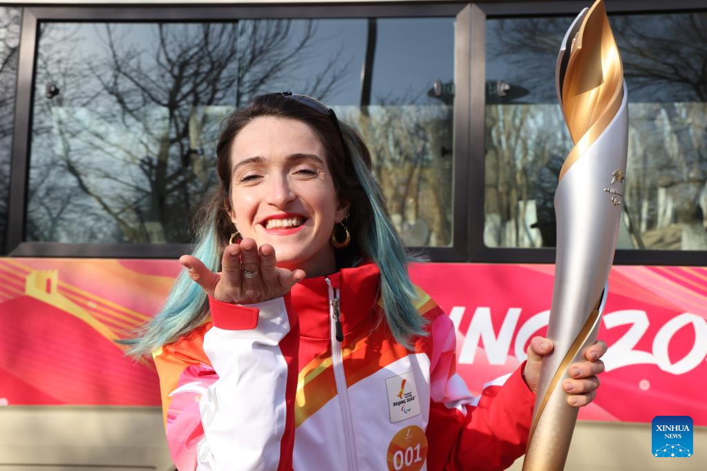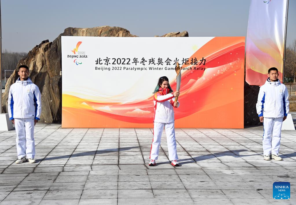 Torchbearer Fu Xiaoyun attends the Beijing 2022 Paralymic Torch Relay at Beijing Expo Park in Beijing, capital of China, March 3, 2022. (Xinhua/Li Xin)