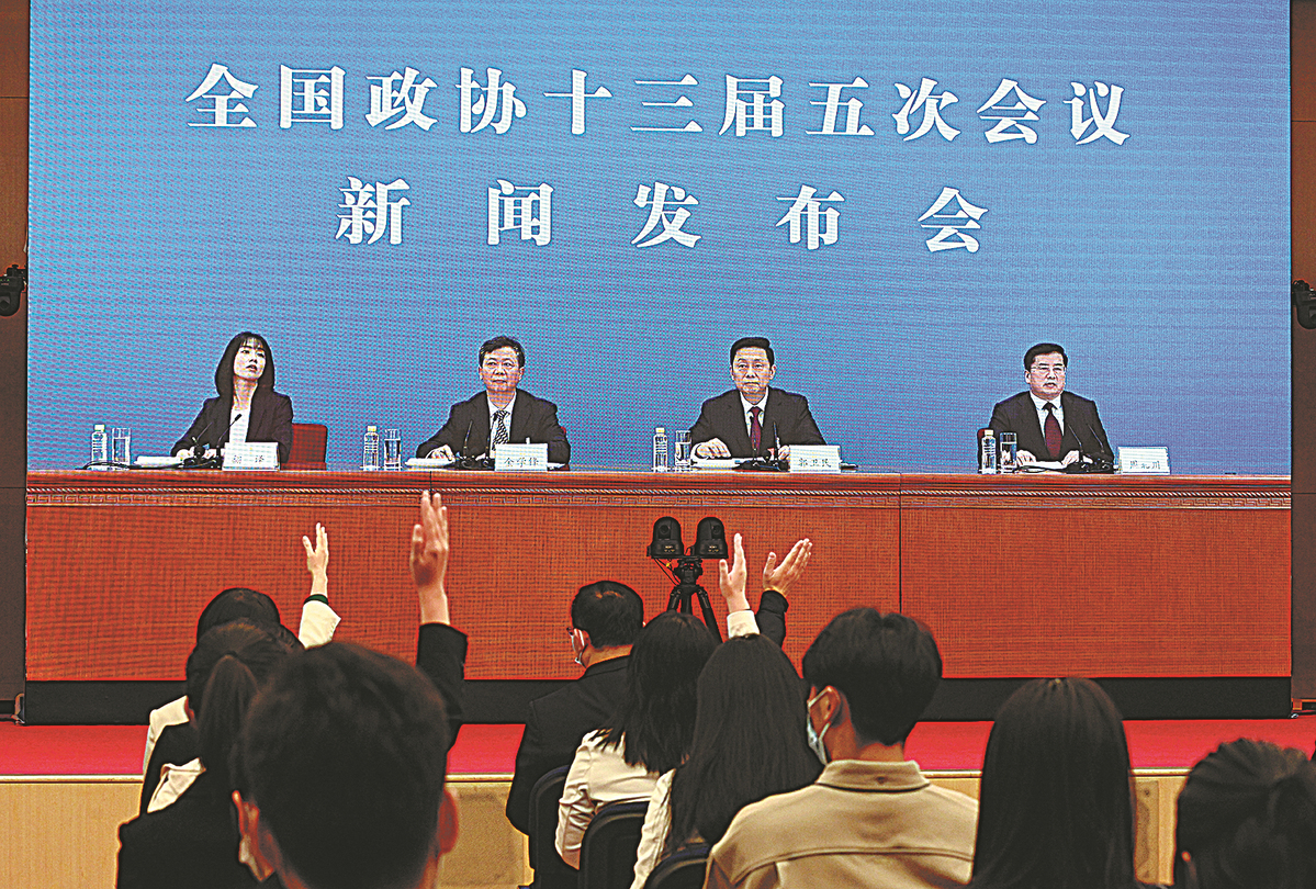 Journalists raise their hands for questions on Thursday at a news conference for the fifth session of the 13th National Committee of the Chinese People's Political Consultative Conference in Beijing. [Photo by Jia Ning/For China Daily]