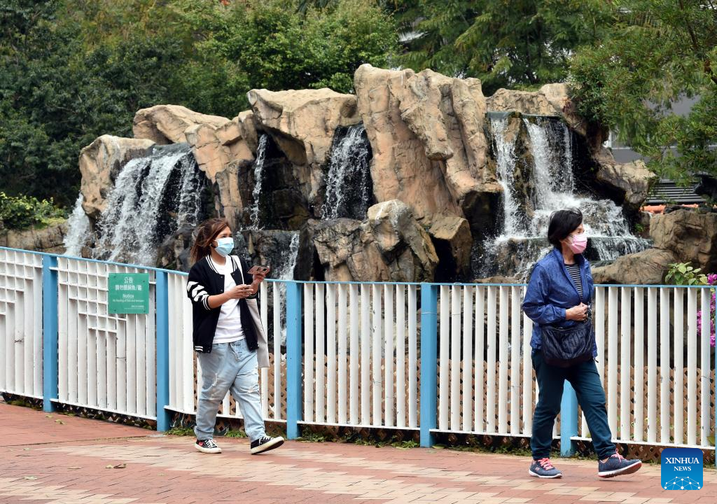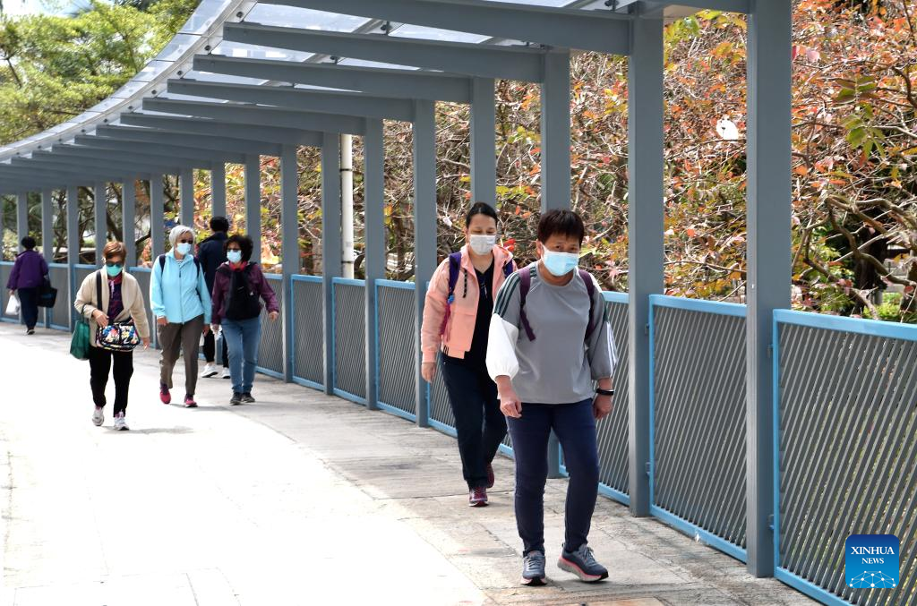 People wearing face masks walk in Tsuen Wan, south China's Hong Kong, March 3, 2022. On Thursday, the government of the Hong Kong Special Administrative Region (HKSAR) reported 56,827 new COVID-19 cases, another record high, with 144 more deaths, official data showed. (Xinhua/Lo Ping Fai)
