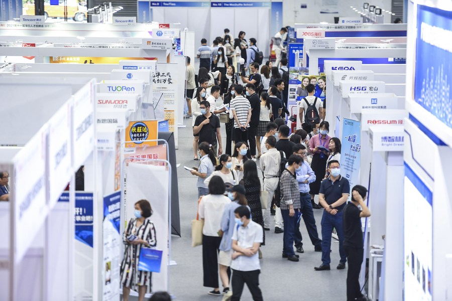Overseas returnees search for job opportunities at a job fair during the 19th Conference on International Exchange of Professionals (CIEP) in Shenzhen, south China's Guangdong Province, April 24, 2021. (Xinhua/Mao Siqian)