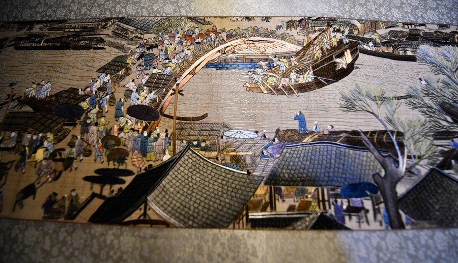 File photo taken on Oct. 23, 2019 shows a part of the grass linen embroidery version of Chinese masterpiece painting "Riverside Scene at Qingming Festival" by Zhang Xiaohong and her colleagues at her workshop in Xinyu City, east China's Jiangxi Province. (Xinhua/Hu Chenhuan)