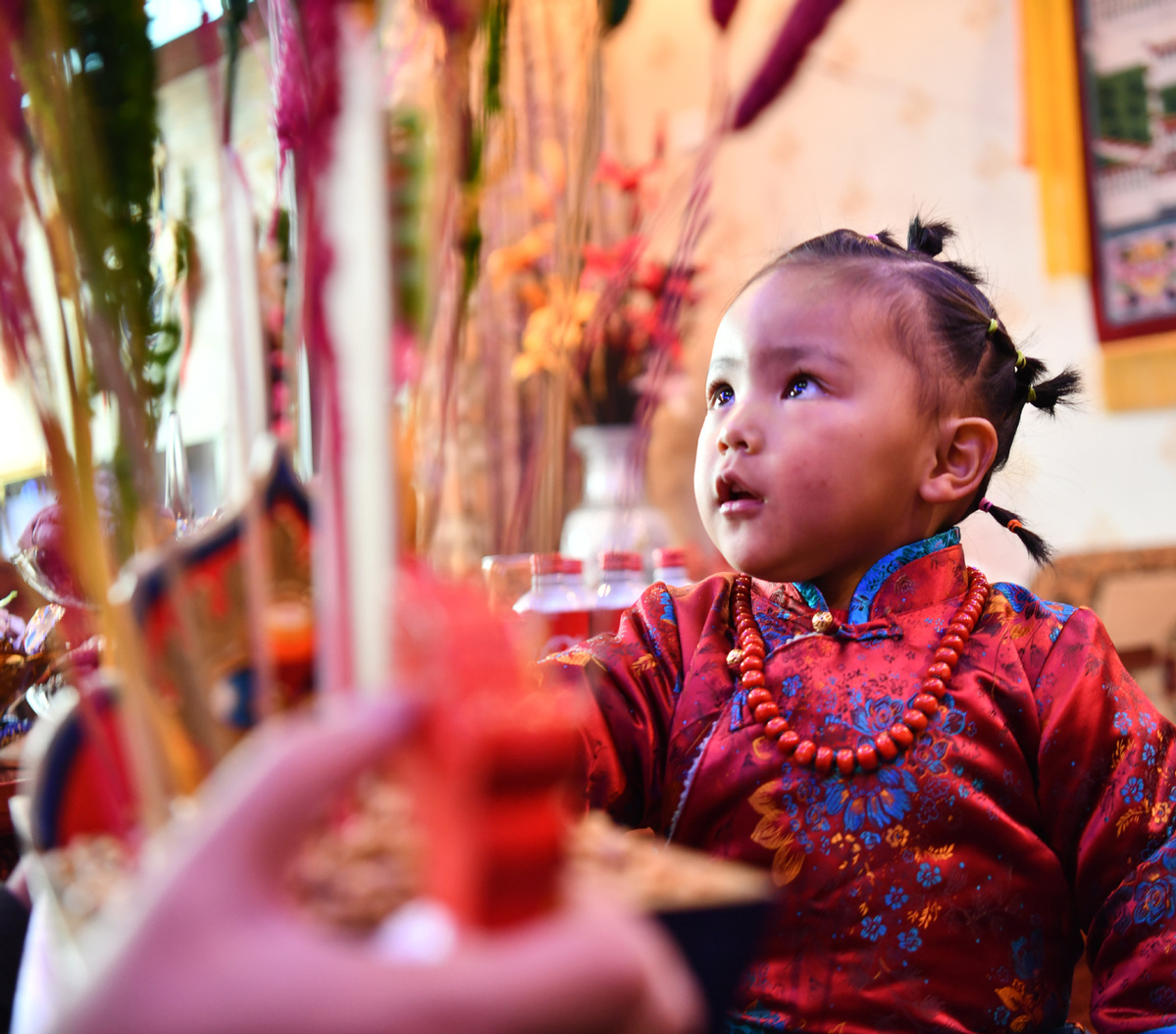 A girl dressed in traditional costumes celebrates the Tibetan New Year in Shannan, Southwest China's Tibet autonomous region, March 3, 2022. [Photo/Xinhua]