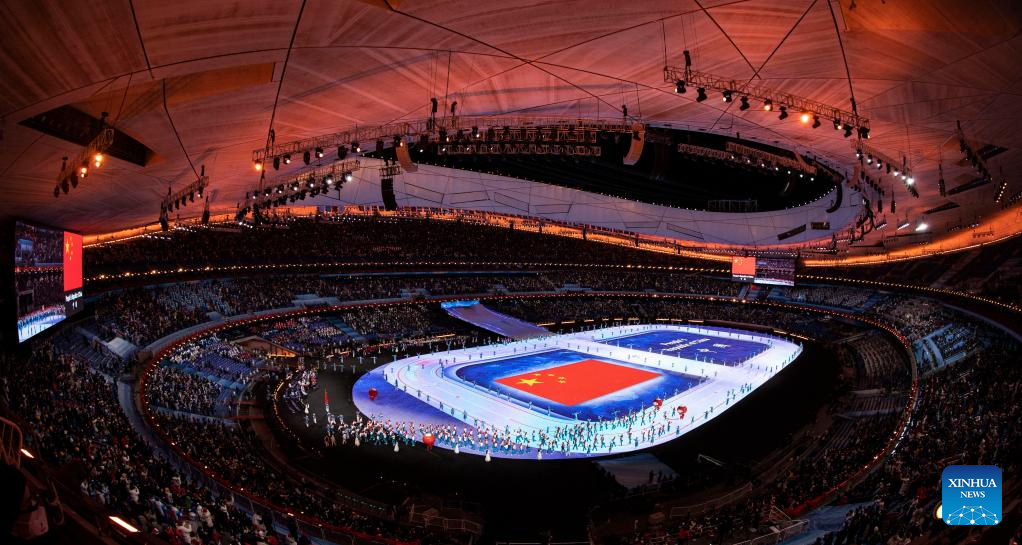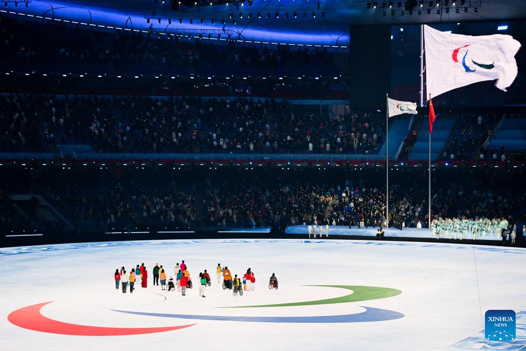 The National Flag of the People's Republic of China is carried during the opening ceremony of the Beijing 2022 Paralympic Winter Games at the National Stadium in Beijing, capital of China, March 4, 2022. (Xinhua/Ren Chao)