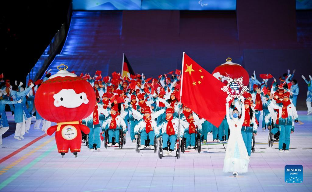 The delegation of the People's Republic of China parade into the National Stadium during the opening ceremony of the Beijing 2022 Paralympic Winter Games at the National Stadium in Beijing, capital of China, March 4, 2022. (Xinhua/Cai Yang)