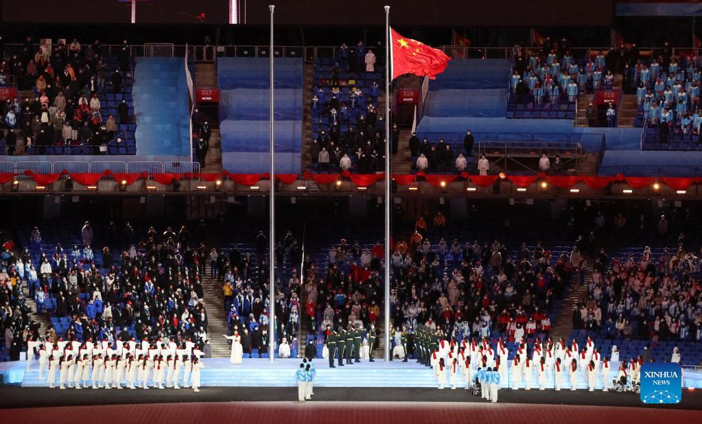 The National Flag of the People's Republic of China is raised during the opening ceremony of the Beijing 2022 Paralympic Winter Games at the National Stadium in Beijing, capital of China, March 4, 2022. (Xinhua/Zhang Keren)