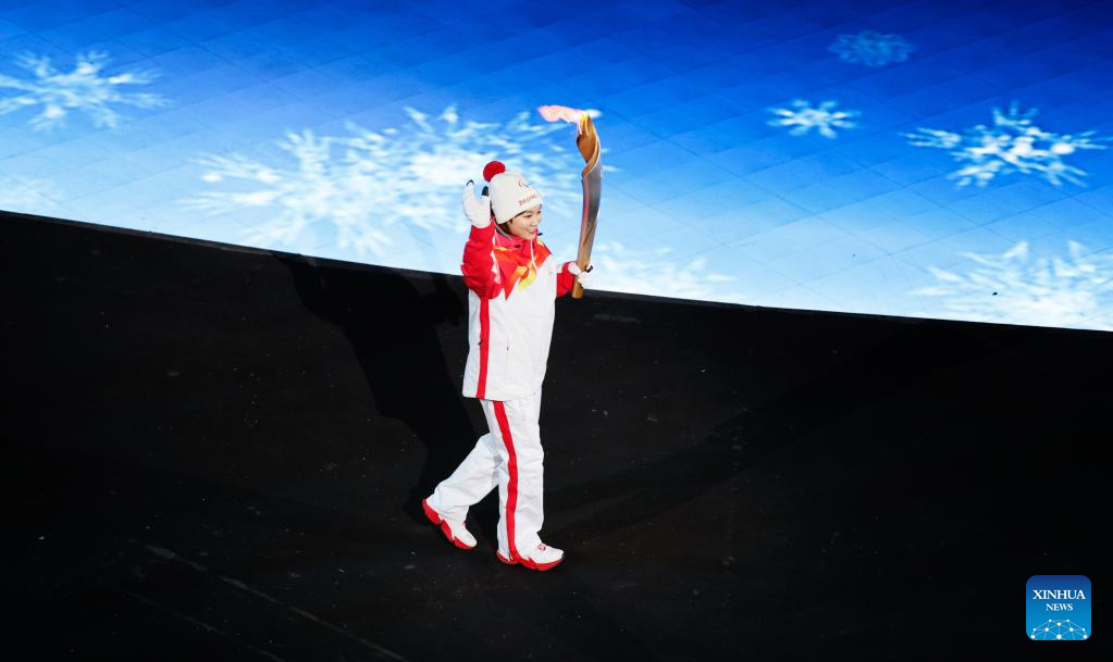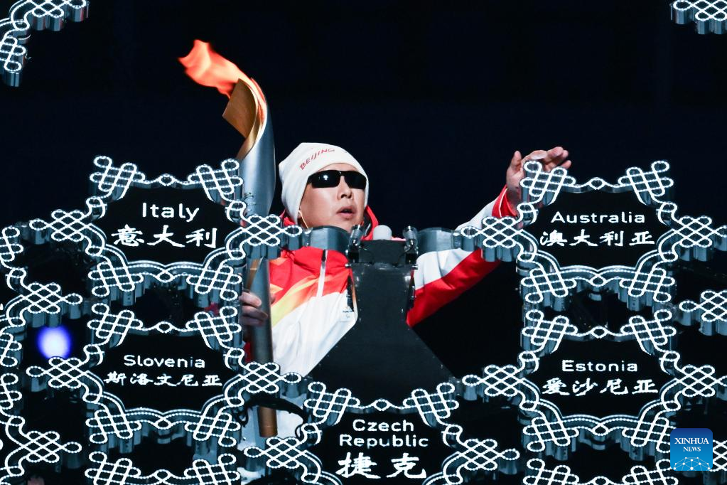 Torchbearer Li Duan prepares to light up the Paralympic Winter Games Cauldron during the opening ceremony of the Beijing 2022 Paralympic Winter Games at the National Stadium in Beijing, capital of China, March 4, 2022. (Xinhua/Lan Hongguang)