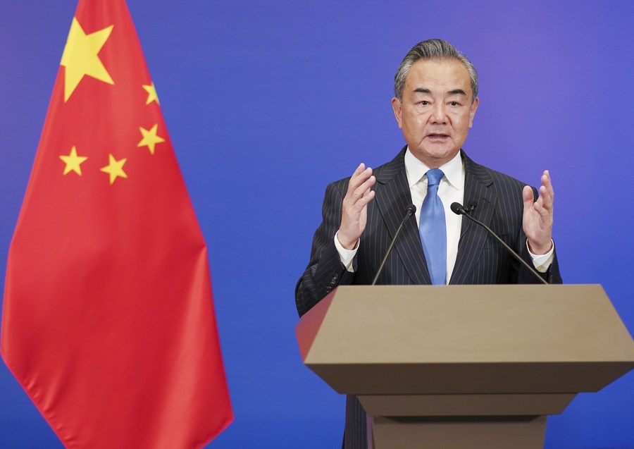 Chinese State Councilor and Foreign Minister Wang Yi addresses the Manila Forum for China-Philippines Relations via video on Jan. 17, 2022. (Xinhua/Ji Chunpeng)