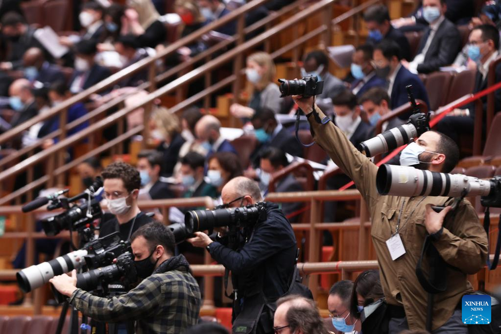 Journalists work during the opening meeting of the fifth session of the 13th National People's Congress (NPC) at the Great Hall of the People in Beijing, capital of China, March 5, 2022. (Xinhua/Jin Liwang)