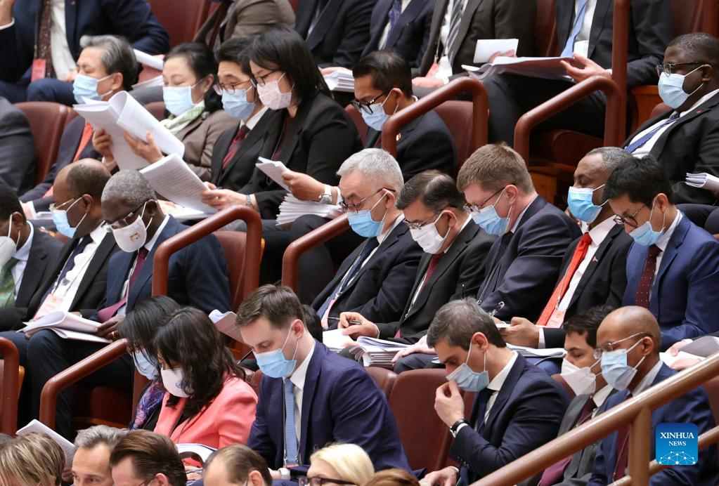 Foreign diplomatic envoys to China observe the opening meeting of the fifth session of the 13th National People's Congress (NPC) at the Great Hall of the People in Beijing, capital of China, March 5, 2022. (Xinhua/Jin Liwang)