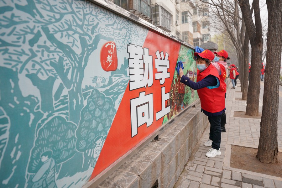 Volunteers clean the roadside boards in Xindu District, Xingtai City, north China's Hebei Province, March 5, 2021. (Xinhua/Mu Yu)