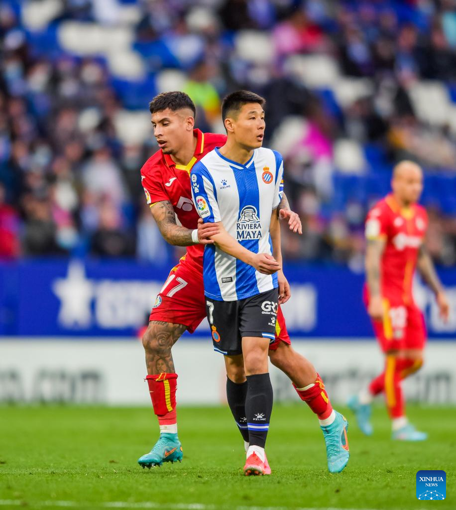 Wu Lei (front) of RCD Espanyol competes during La Liga Santander match between RCD Espanyol and Getafe CF in RCDE Stadium, Cornella, Spain, on March 5, 2022. (Photo by Joan Gosa/Xinhua)
