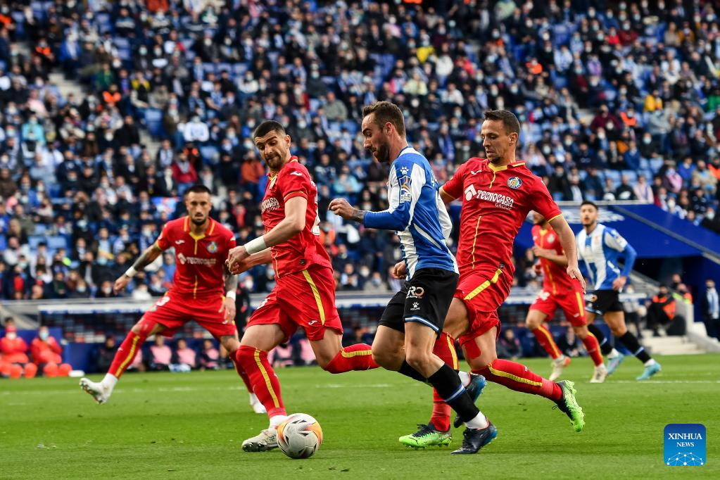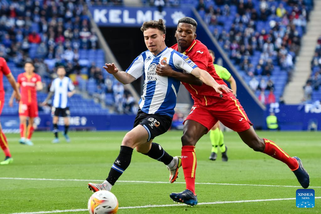 Adria Pedrosa (R) of RCD Espanyol vies with J. Iglesias of Getafe CF during La Liga Santander match between RCD Espanyol and Getafe CF in RCDE Stadium, Cornella, Spain, on March 5, 2022. (Photo by Joan Gosa/Xinhua)