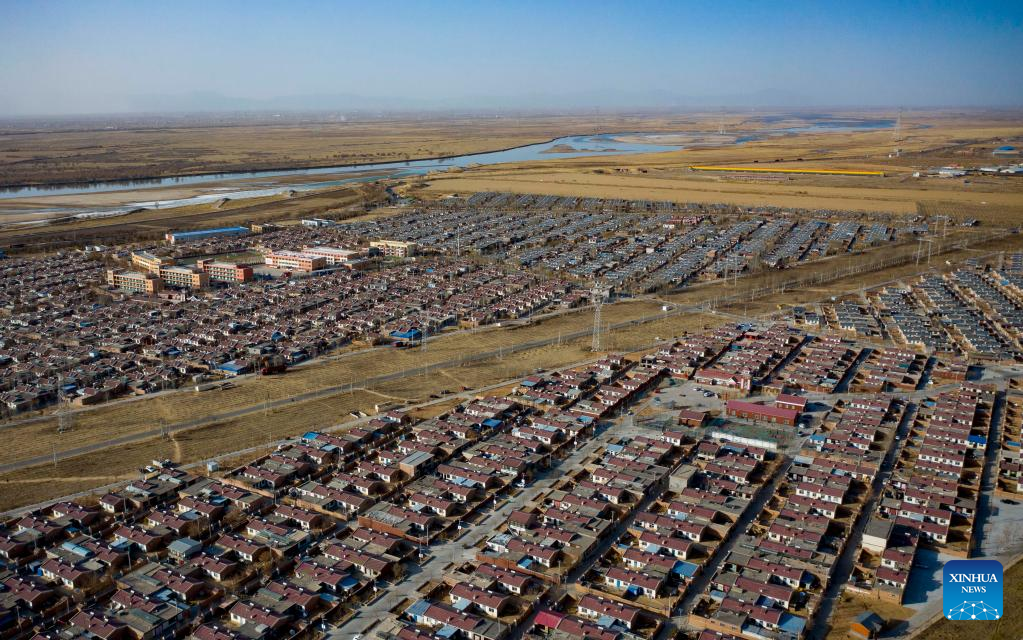 Aerial photo taken on March 4, 2022 shows a view of a village in Yueyahu Township, Yinchuan, capital of northwest China's Ningxia Hui Autonomous Region. Zhang Jing, an inheritor of intangible cultural heritage of hemp weaving, came to Yueyahu Township at the end of 2017, and set up a training class and a hemp weaving workshop here. Most of the trainees are women, with the youngest 26 years old and the oldest over 70.
