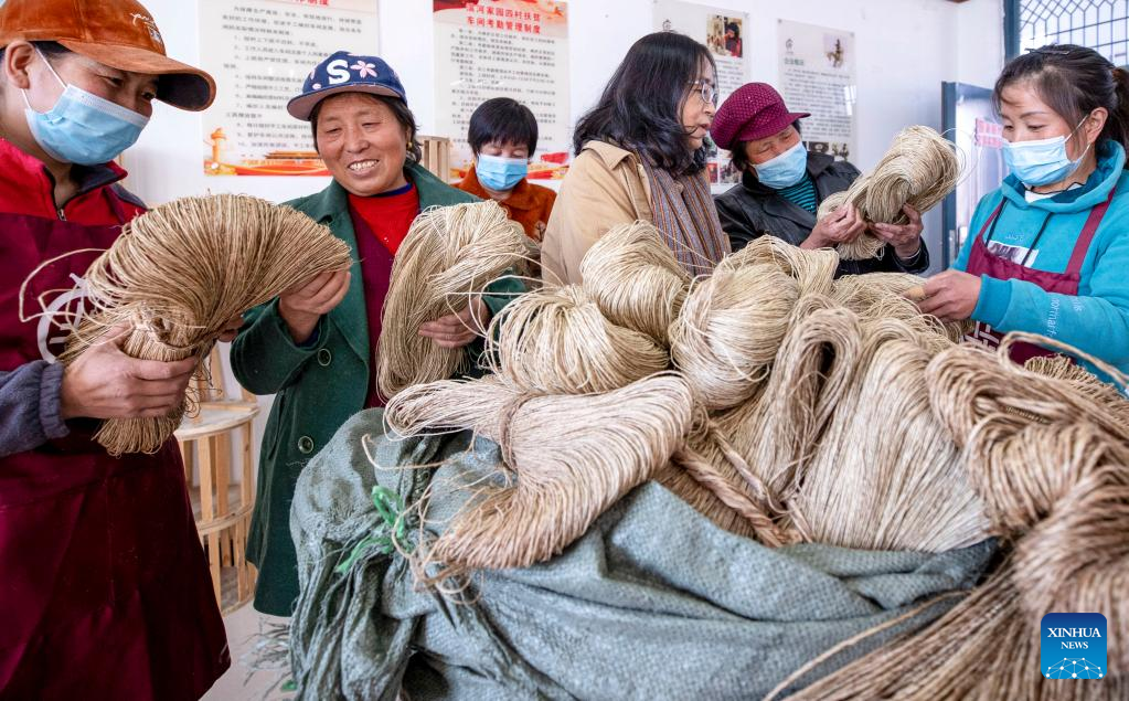 Villagers select the raw material of hemp weaving in Yueyahu Township, Yinchuan, capital of northwest China's Ningxia Hui Autonomous Region, March 4, 2022. Zhang Jing, an inheritor of intangible cultural heritage of hemp weaving, came to Yueyahu Township at the end of 2017, and set up a training class and a hemp weaving workshop here. Most of the trainees are women, with the youngest 26 years old and the oldest over 70.