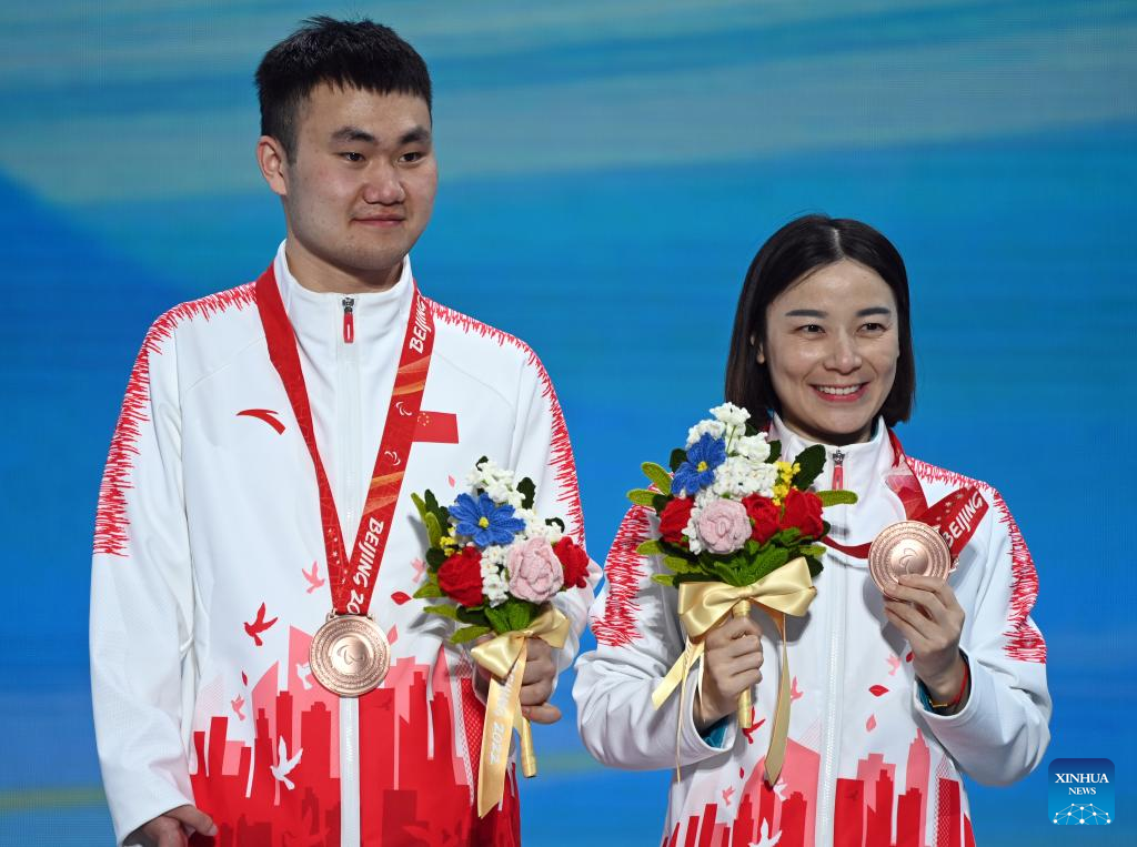 Bronze medalist Liu Mengtao of China poses for a photo during the awarding ceremony of Para Biathlon Men's Sprint Sitting of Beijing 2022 Paralympic Winter Games at Zhangjiakou Medals Plaza in Zhangjiakou, north China's Hebei Province, March 6, 2022. (Xinhua/Peng Ziyang)